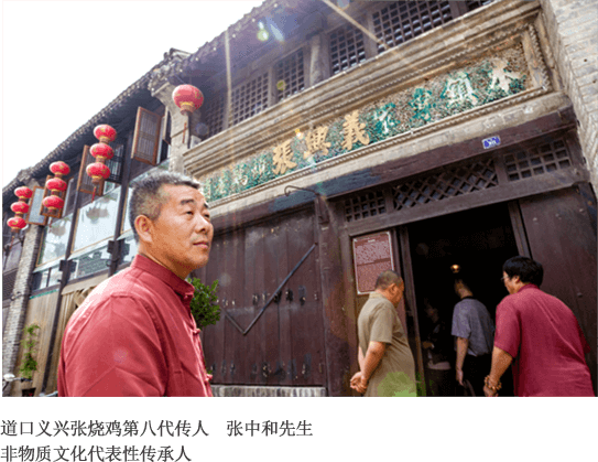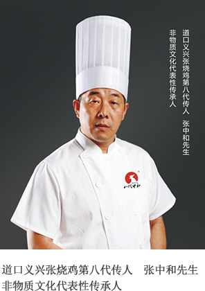 總經(jīng)理張中和先生,為道口義興張燒雞第八代嫡傳人,非物質(zhì)文化遺產(chǎn)傳承人。張中和先生制作的道口燒雞,選用地方當(dāng)年優(yōu)良健康活雞,沿用傳統(tǒng)燒雞技藝和現(xiàn)代工藝相結(jié)合,經(jīng)十多道工序,佐以十味天然香辛料,輔以循環(huán)老湯,精工制作而成,其成品皮色鮮艷,色成柿黃;造型獨特,狀如元寶;口若銜趺,異香濃郁;熟爛脫骨,咸淡適口。